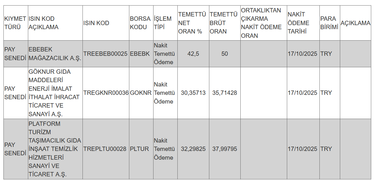 Kamuyu Aydınlatma Platformuna (KAP) yapılan açıklamaya göre, Merkezi Kaydi Sistemde gerçekleştirilen hak kullanım ödemelerine ait kayıtlar şöyle: